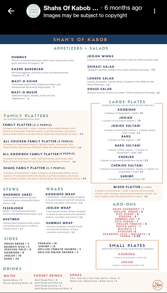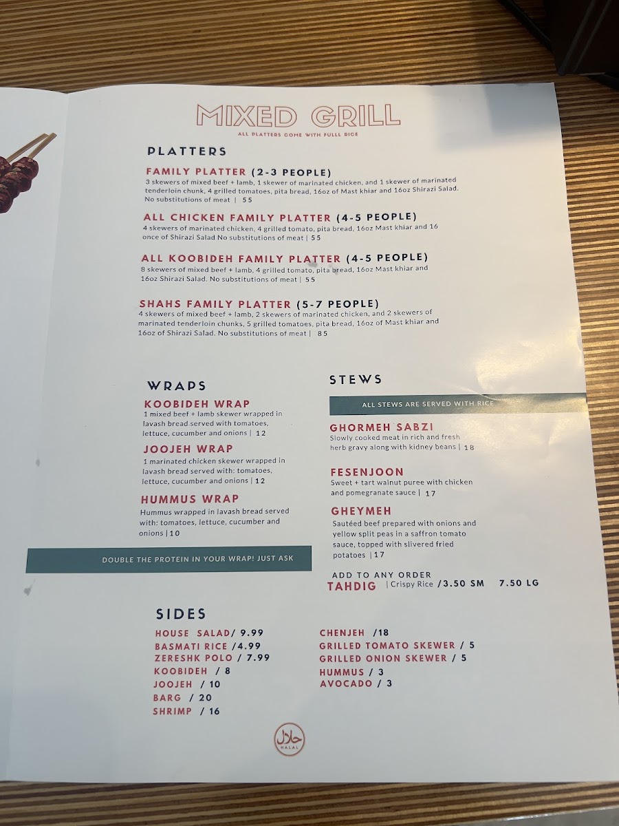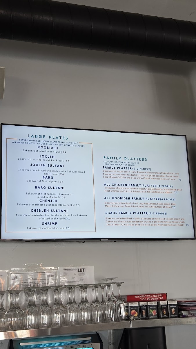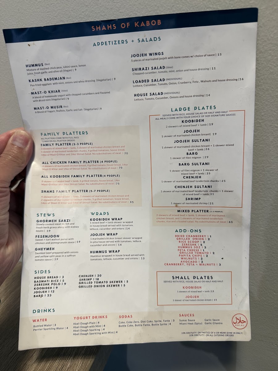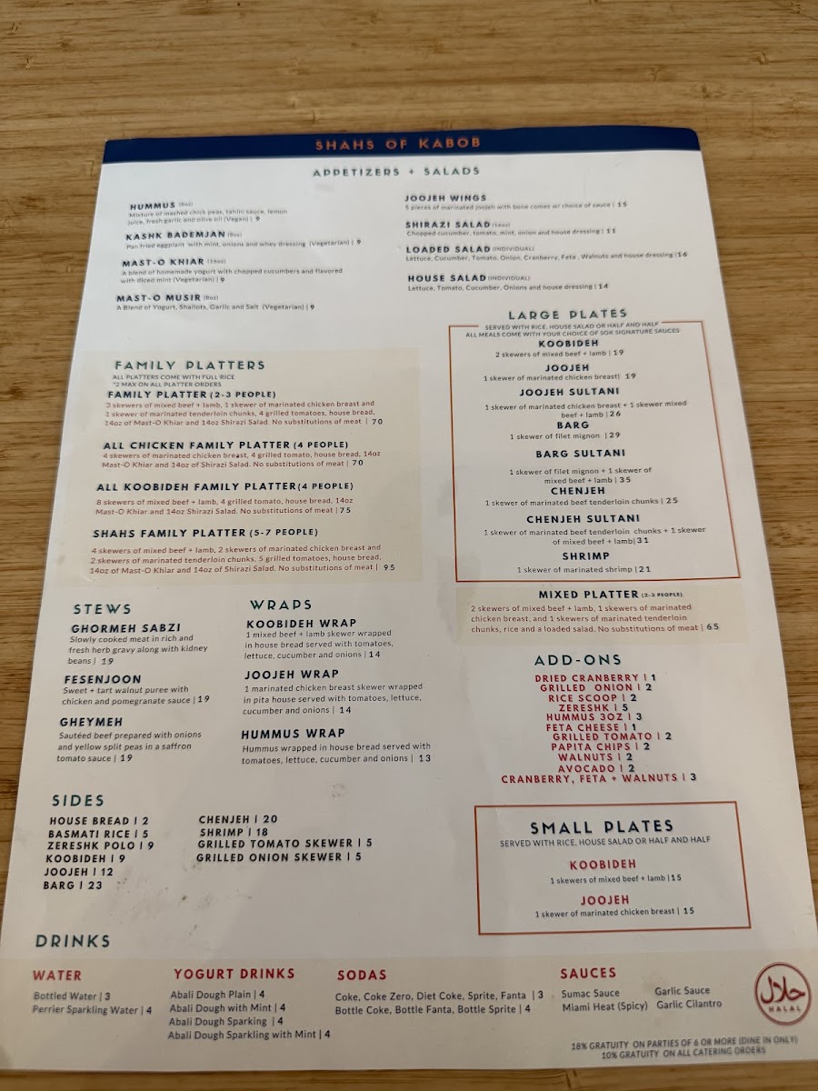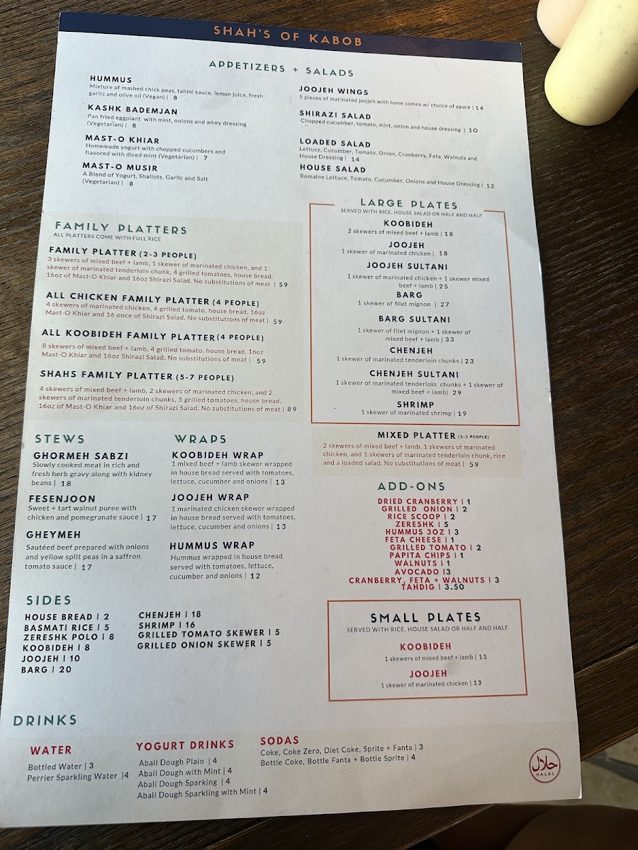From a reviewer’s perspective, the menu at Shahs Of Kabob Wynwood feels like a well-curated summary of classic Persian comfort food, balancing variety with focus. The experience often begins with appetizers and salads such as HUMMUS, KASHK BADEMJAN, MAST-O KHIAR, MAST-O MUSIR, and JOOJEH WINGS, which set a rich, creamy, and aromatic tone for the meal. For groups, the family-style offerings stand out, including the generous FAMILY PLATTER, ALL CHICKEN FAMILY PLATTER, ALL KOOBIDEH FAMILY PLATTER, and SHAHS FAMILY PLATTER, designed to showcase multiple proteins and flavors in one satisfying spread. The stew section highlights traditional Iranian favorites like GHORMEH SABZI, FESENJOON, and GHEYMEH, each offering deep, slow-cooked flavors that contrast nicely with the smoky grilled dishes. For a quicker option, wraps such as the KOOBIDEH WRAP, JOOJEH WRAP, and HUMMUS WRAP provide portability without sacrificing taste. The heart of the menu lies in the large plates, including KOOBIDEH, JOOJEH, JOOJEH SULTANI, BARG SULTANI, and JOOJEH SULTANI, which highlight expertly grilled meats served in classic combinations. Diners can further customize their meal with add-ons like DRIED CRANBERRY, GRILLED ONION, RICE SCOOP, ZERESHKI, and HUMMUS 3OZ, as well as sides such as HOUSE BREAD, BASMATI RICE, ZERESHK POLO, KOOBIDEH, and JOOJEH. Smaller appetites are well covered with SMALL PLATES of KOOBIDEH and JOOJEH, while beverages like Bottled Water, Perrier Sparkling Water, Abali Dough Plain, Abali Dough with Mint, and Abali Dough Sparking keep the experience authentic and refreshing. Finally, sauces including Sumac Sauce, Miami Heat, Garlic Sauce, and Garlic Cilantro allow each guest to adjust heat and tang to their liking, making the menu feel complete, flexible, and thoughtfully assembled.